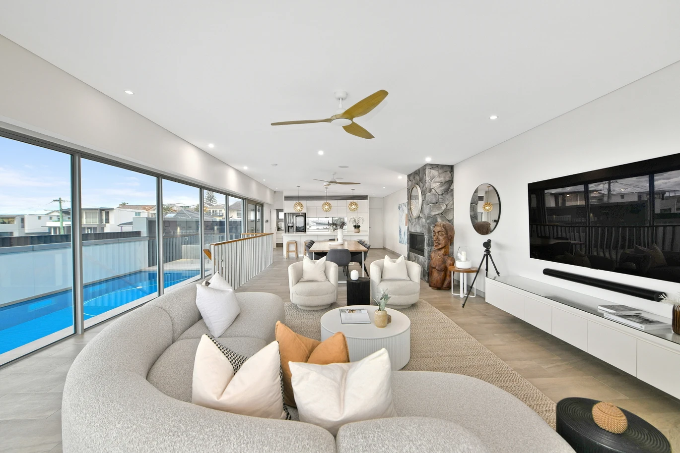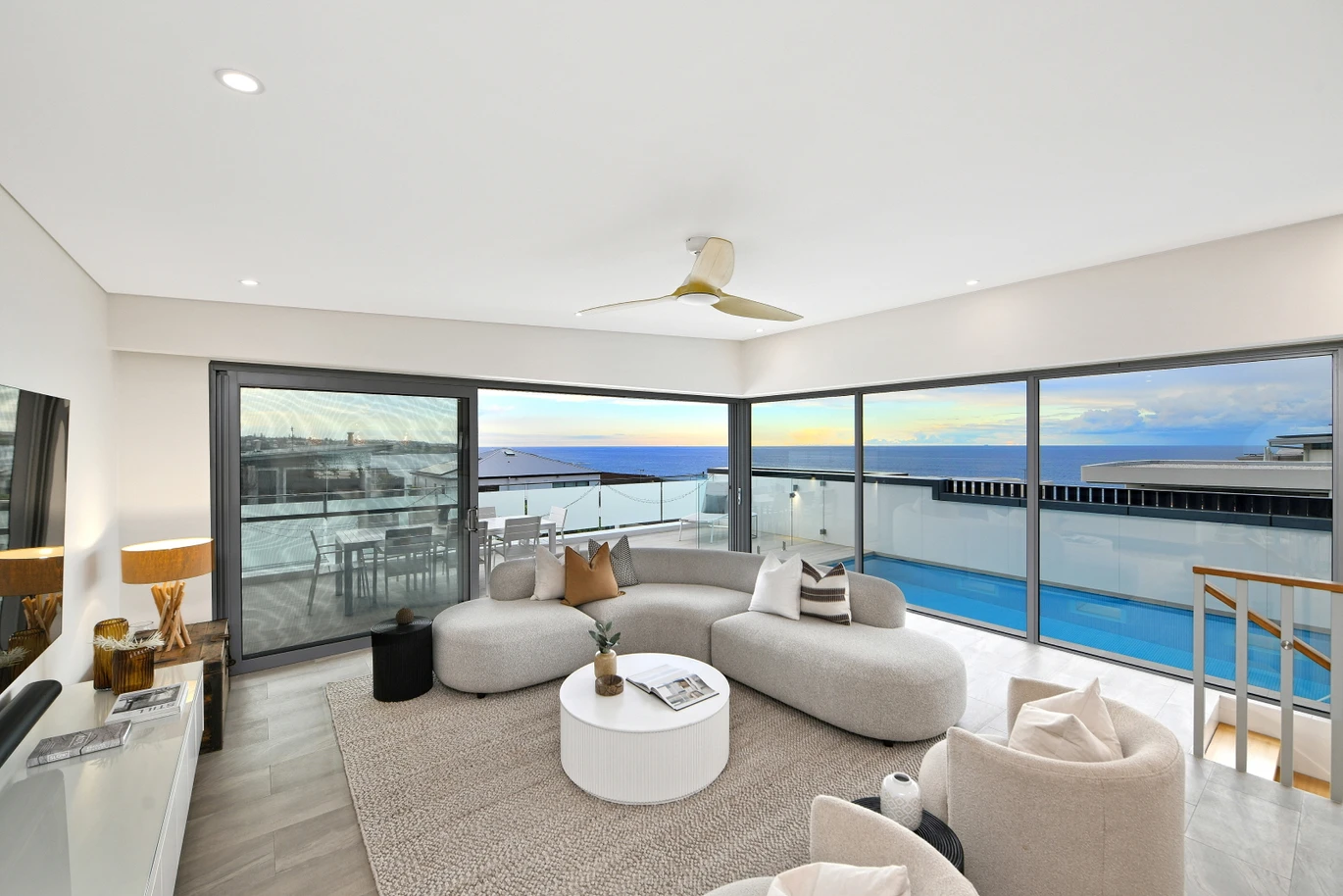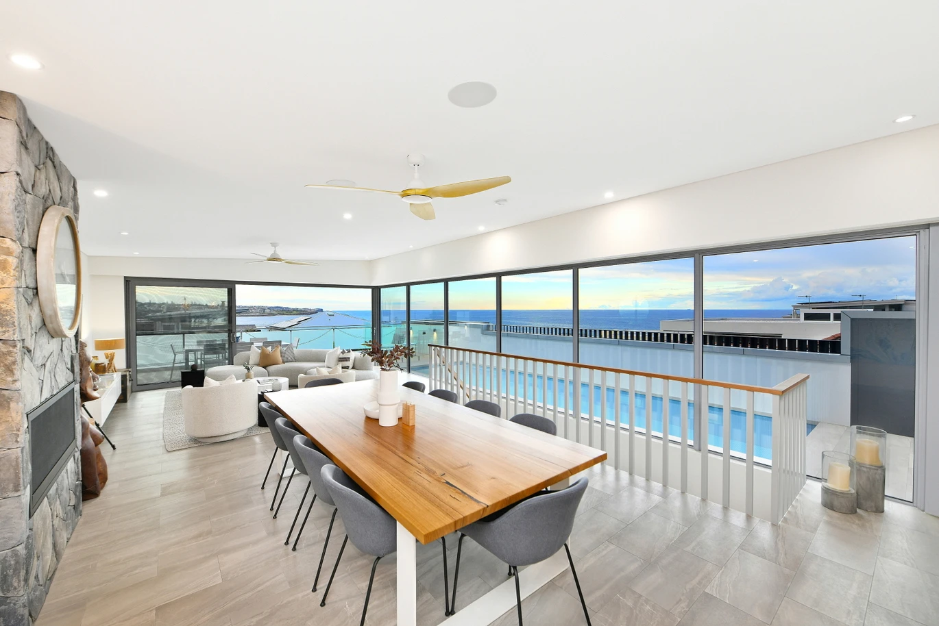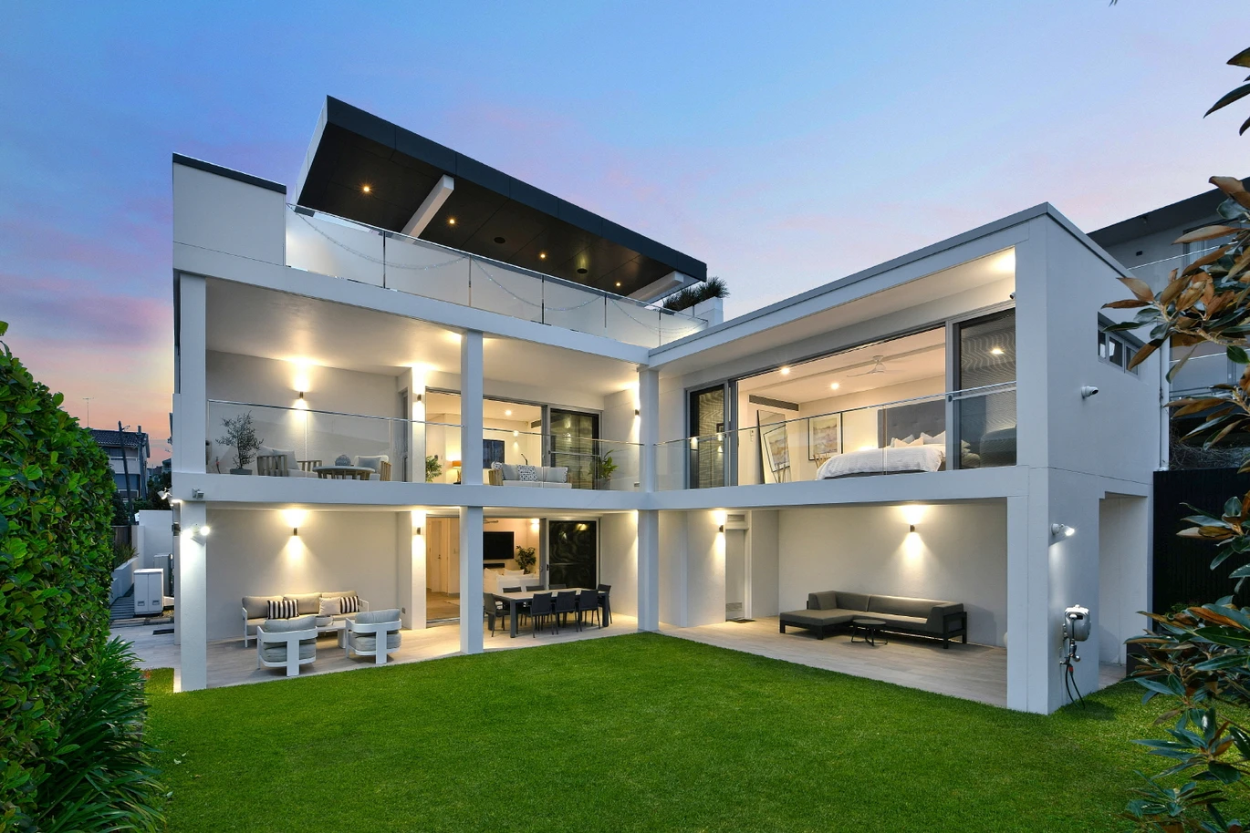 Architecturally, the northward sea views were maximised as were the multiple level inside/outside living areas where large overhanging rooves were provided over the terraces over three levels for the best of beachside living.